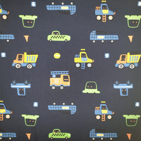Lovely dark blue cotton jersey with cars, this fabric is versatile with a good stretch. Perfect for many different items of clothing. Looks great with many of our solid jerseys, including orange, green, ochre, black and white as pictured.